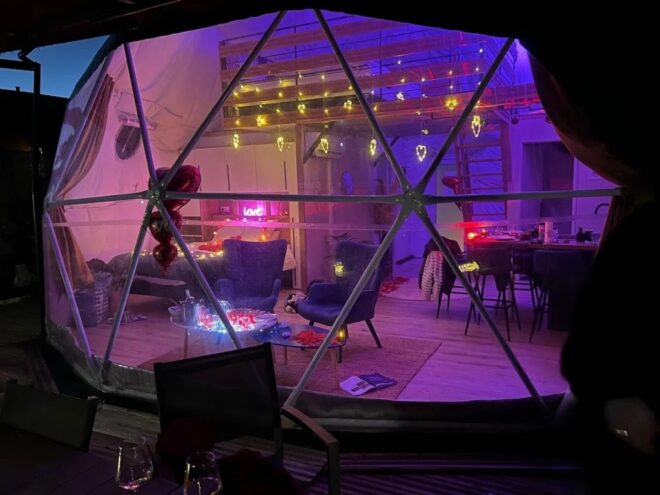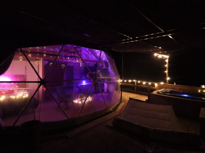 Le véritable point fort de la Bulle d’Amour réside sur sa terrasse bois privative : un spa privé rigide, disponible en accès illimité. Que ce soit sous le soleil des Corbières ou sous un ciel étoilé d’une pureté rare, le jacuzzi offre un moment de complicité unique. À la nuit tombée, des jeux de lumières LED transforment le dôme en un cocon chaleureux, idéal après une journée passée à explorer les châteaux cathares ou les plages de la Méditerranée.