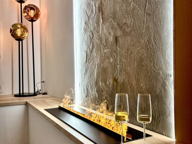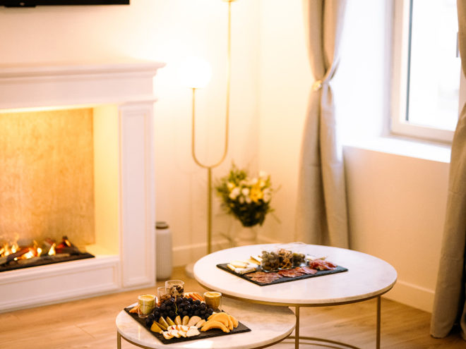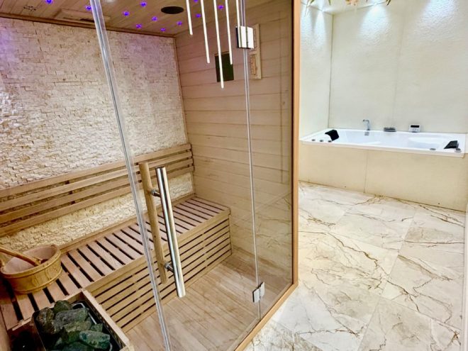 Nous avons immédiatement profité du jacuzzi et du sauna, enveloppés par une ambiance musicale apaisante. Ayant tout préparé à l’avance, nous avions opté pour la planche gourmande et une bouteille de rosé… un pur moment de gourmandise ! Les produits, frais et savoureux, se sont parfaitement mariés avec le rosé. Puis, blottis l’un contre l’autre, nous avons savouré l’ambiance feutrée de la cheminée à vapeur, dont les flammes dansantes ont sublimé notre soirée… un instant de pur bonheur.