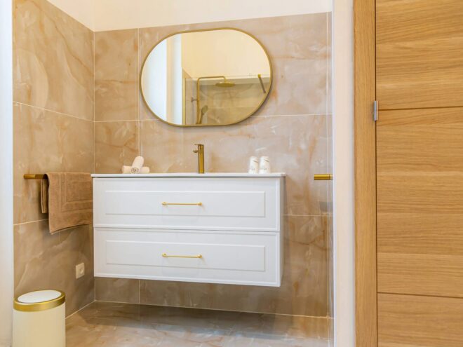 La salle de bains devient un véritable sanctuaire de détente. La baignoire balnéo deux places invite à un rituel sensoriel où l’eau, les jeux de lumière s’accordent pour éveiller tous vos sens. À ses côtés, une douche à l’italienne et un linge moelleux prolongent les instants de bien-être et d’abandon.