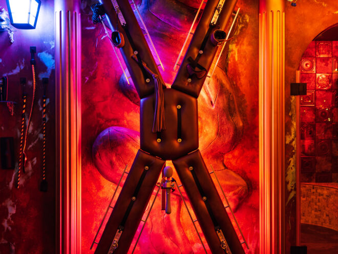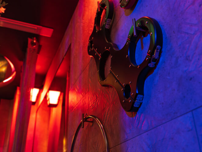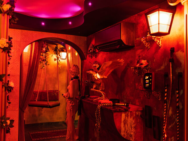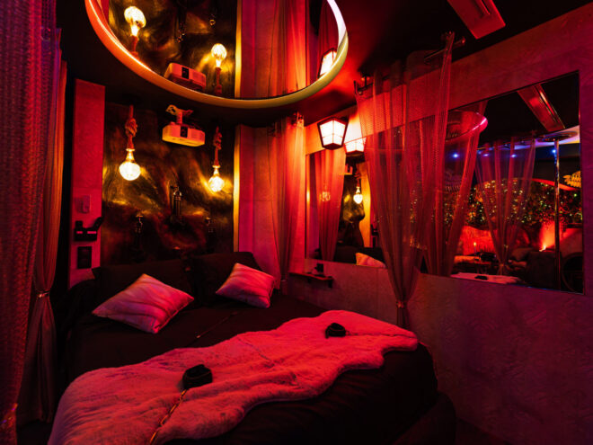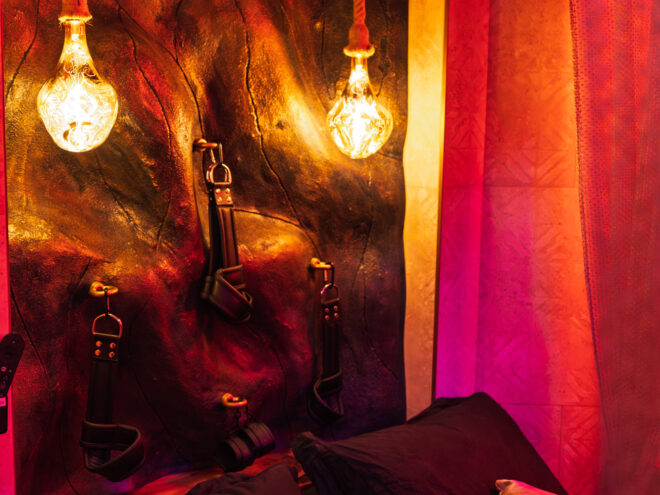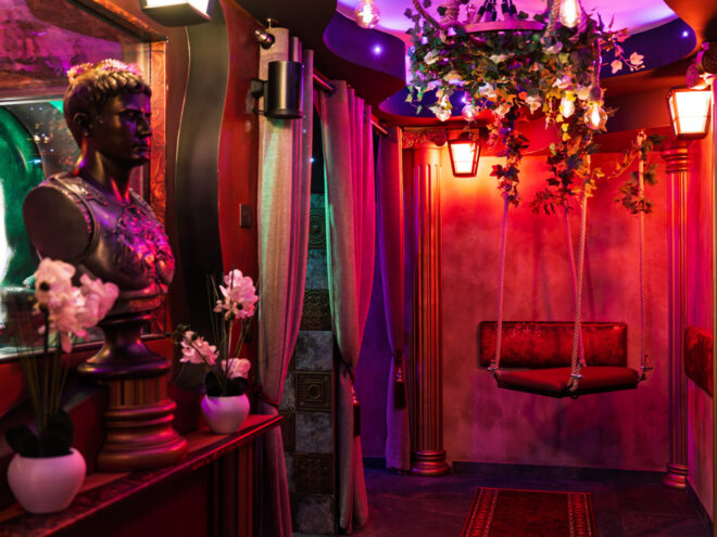 Insolite - Location - Love room - Suite pour amoureux - Cheminée - Croix de Saint André - Fauteuil Tantra - Hammam - Jacuzzi - Jacuzzi privatif - Lit à baldaquins - Pièce érotique ou coquine - Pôle dance - Romantique - En Ville - Occitanie - Sud de la France - Sud est - Climatisation - Départ tardif - Espace Bien-être / Spa - Musique incluse - Pétales de roses - Wifi -