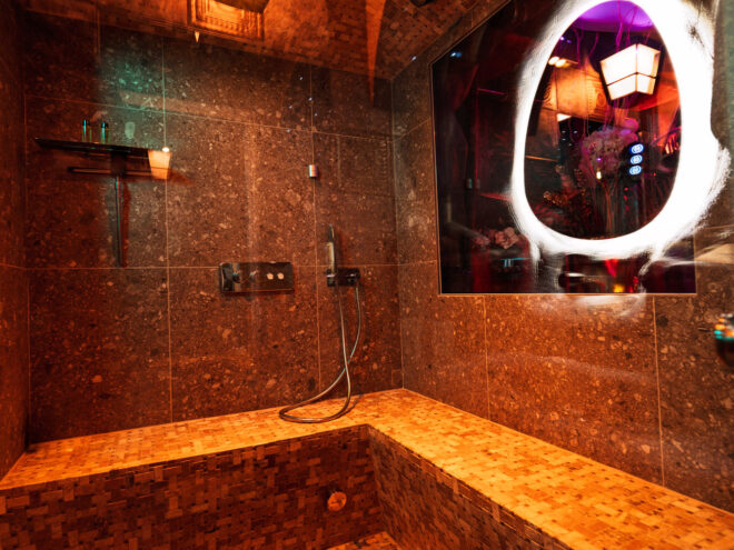 de chromathérapie et d’aromathérapie. Une grande douche hammam avec ciel de pluie vient