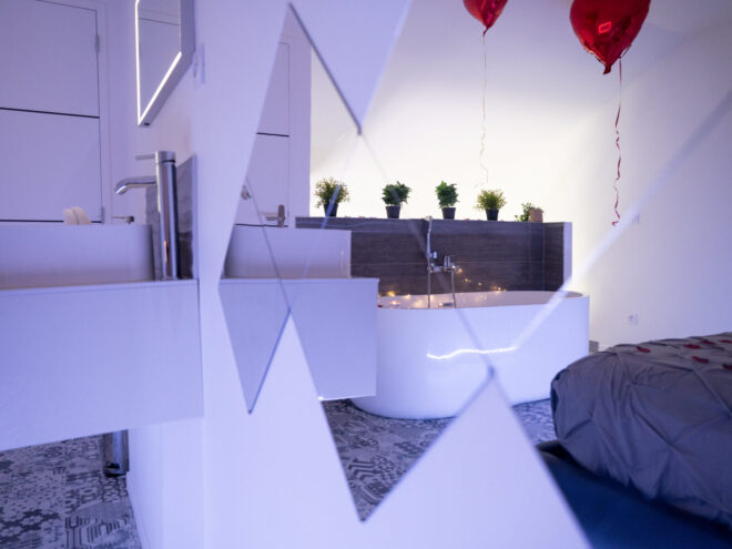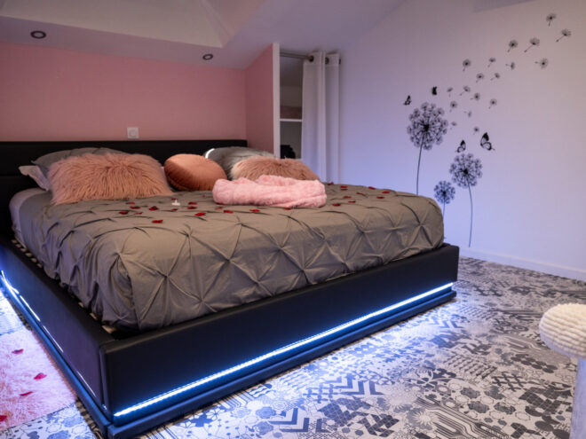 Située à Istres, cette suite de 50 m² séduit par son atmosphère moderne et raffinée, où chaque détail a été pensé pour créer un cadre harmonieux et reposant. Dès l’entrée, la lumière naturelle s’impose et sublime les teintes douces mêlant rose et gris, créant une ambiance chaleureuse et enveloppante. L’espace de vie s’articule autour d’une balnéo, et d'une cheminée véritable invitation à la relaxation, idéale pour s’accorder un moment de bien-être en toute intimité. La suite dispose également d’un jardinet privatif, offrant un espace extérieur discret et agréable, parfait pour prolonger l’expérience dans un environnement calme et apaisant. Des transats pour savourer le soleil provençal et bronzer à l'abris des regards. L’agencement en duplex apporte charme et caractère à ce lieu. À l’étage, l’espace nuit dévoile un lit king size installé sous un velux, baigné de lumière en journée et propice à une atmosphère douce et romantique à la nuit tombée. Un véritable cocon suspendu, pensé pour se retrouver et savourer l’instant. Le bain en ilot, s’intègre parfaitement à l’ensemble luxueux et prolonge cette sensation de confort et de sérénité. Chaque séjour inclut un petit déjeuner frais, délicatement préparé, pour commencer la journée tout en douceur. Il est déposé le matin discrètement ! Pour parfaire cette expérience à deux, différentes prestations sont proposées : repas, plateau apéritif, brunch, champagne, douceurs sucrées ou encore décoration romantique, permettant de personnaliser chaque moment selon les envies.